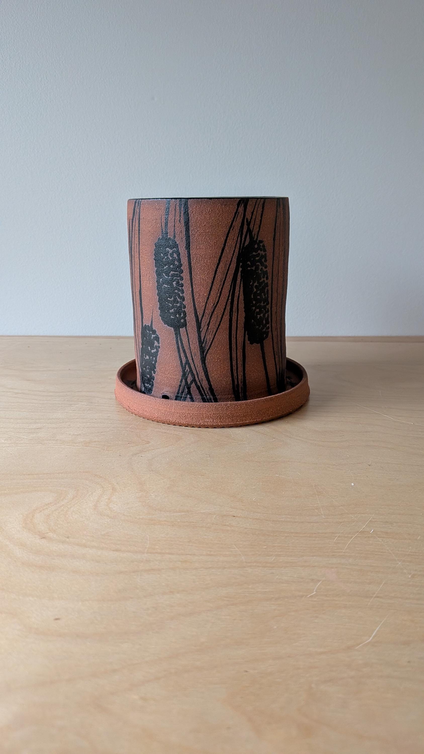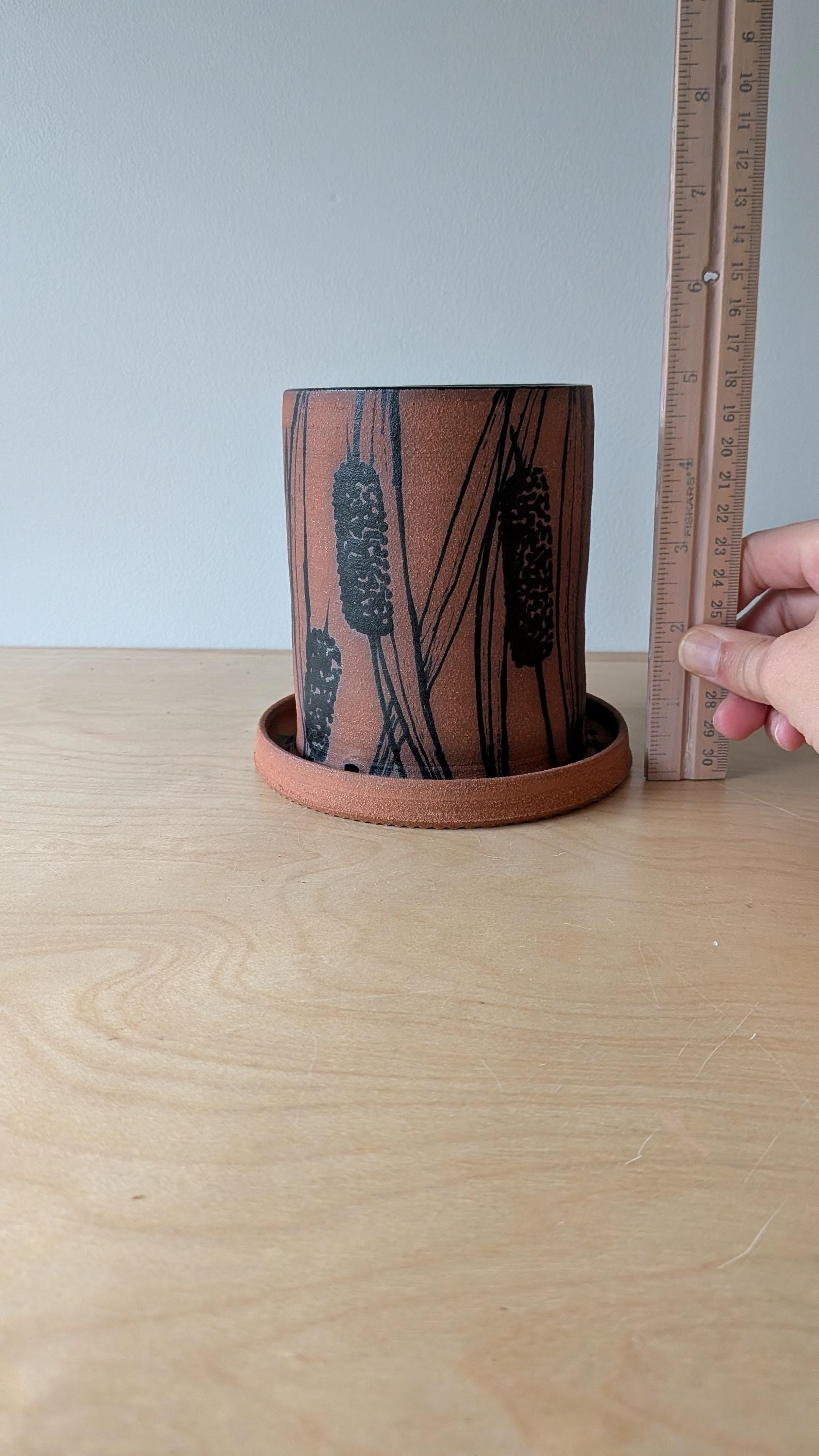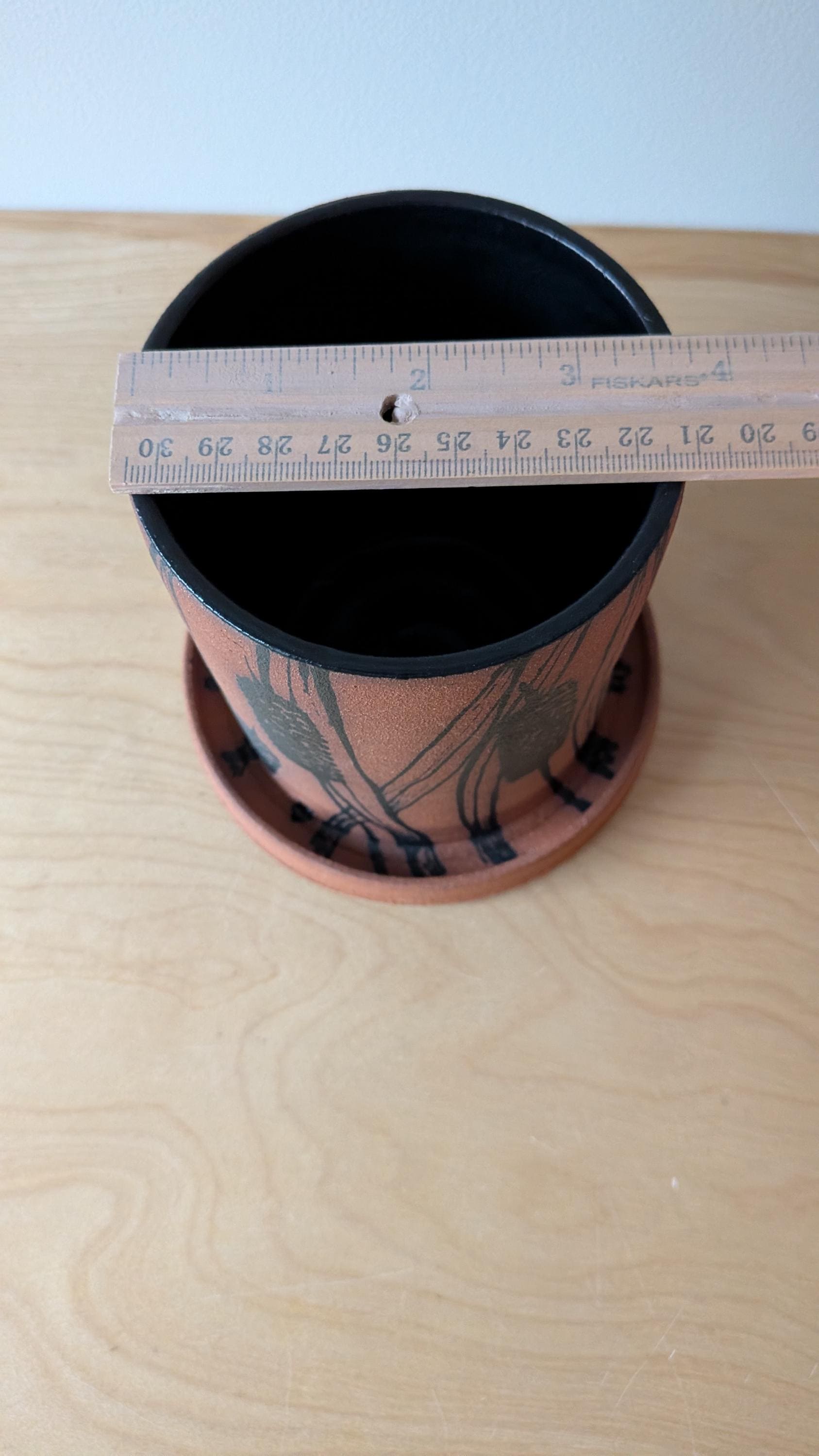 Each pot is thrown on the wheel, to include a overflow space for watering. The design is hand drawn on stoneware clay, fired to about 1900 degrees, glazed and fired again to about 2200 degrees.