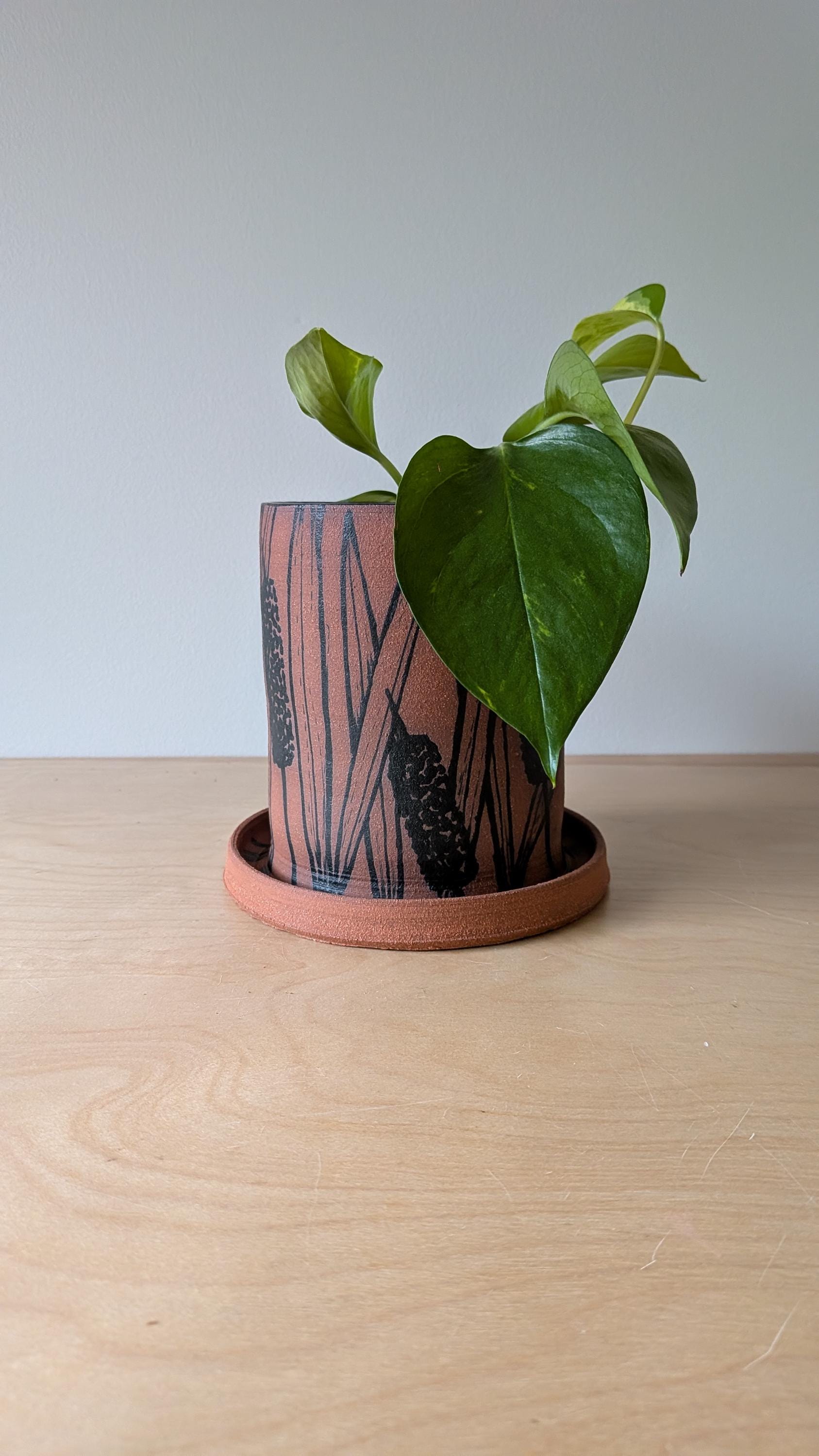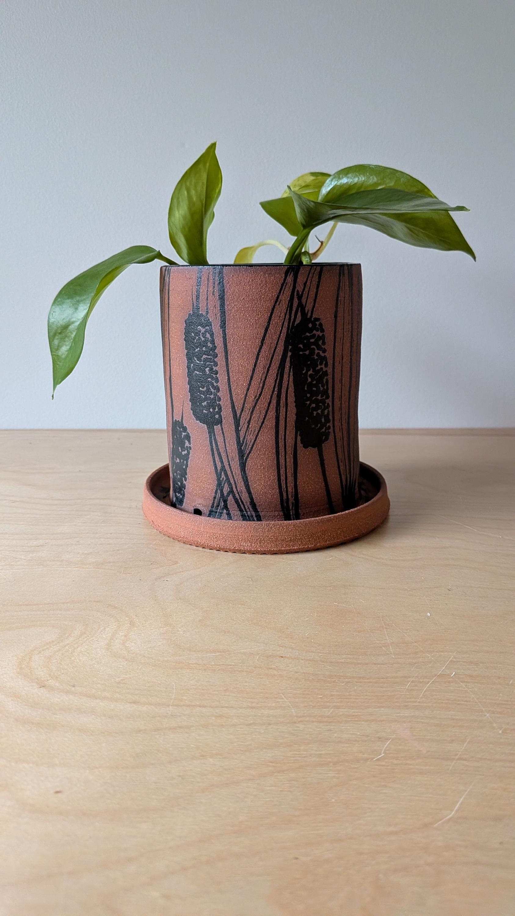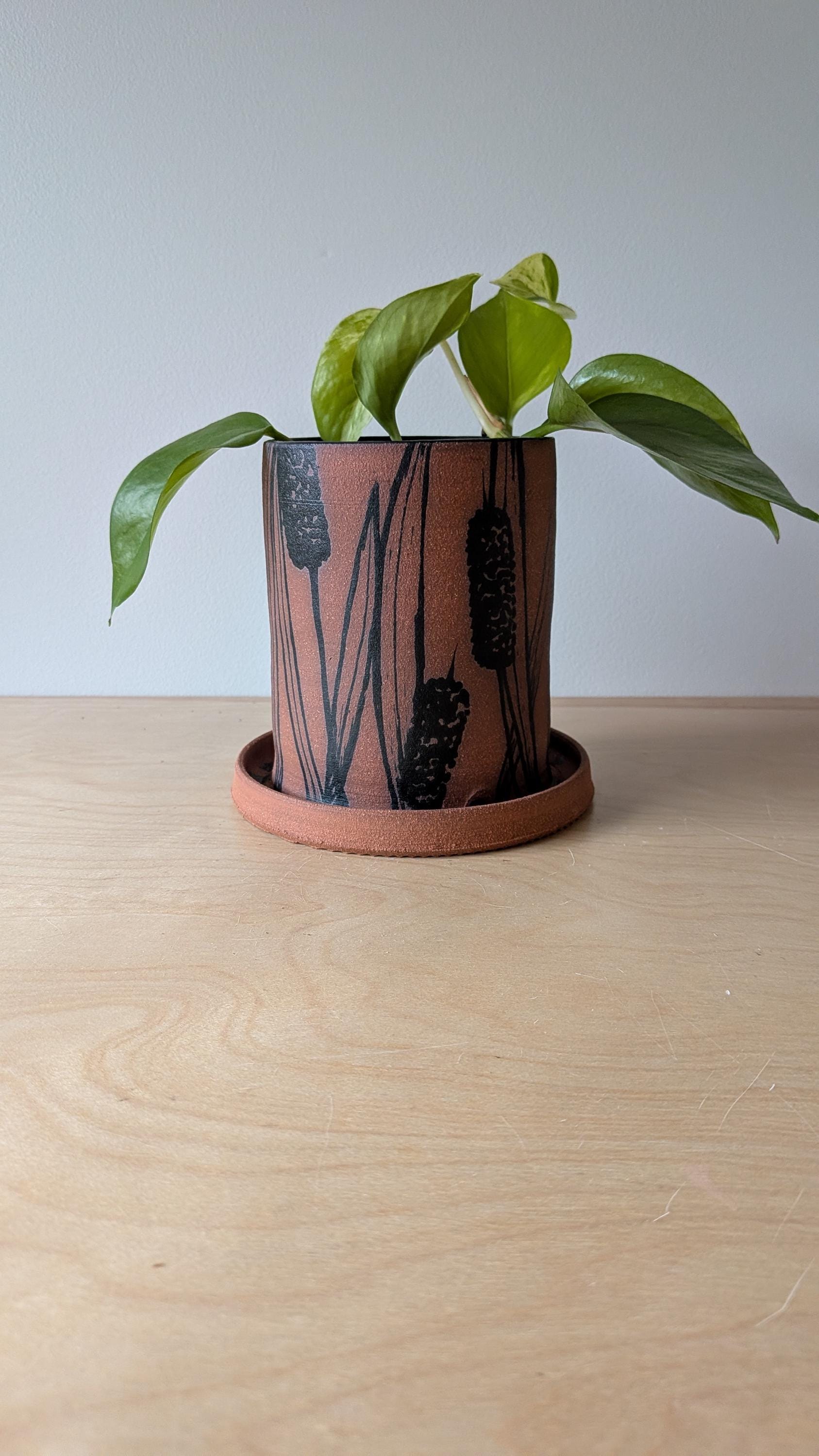 Each pot is thrown on the wheel, to include a overflow space for watering. The design is hand drawn on stoneware clay, fired to about 1900 degrees, glazed and fired again to about 2200 degrees.