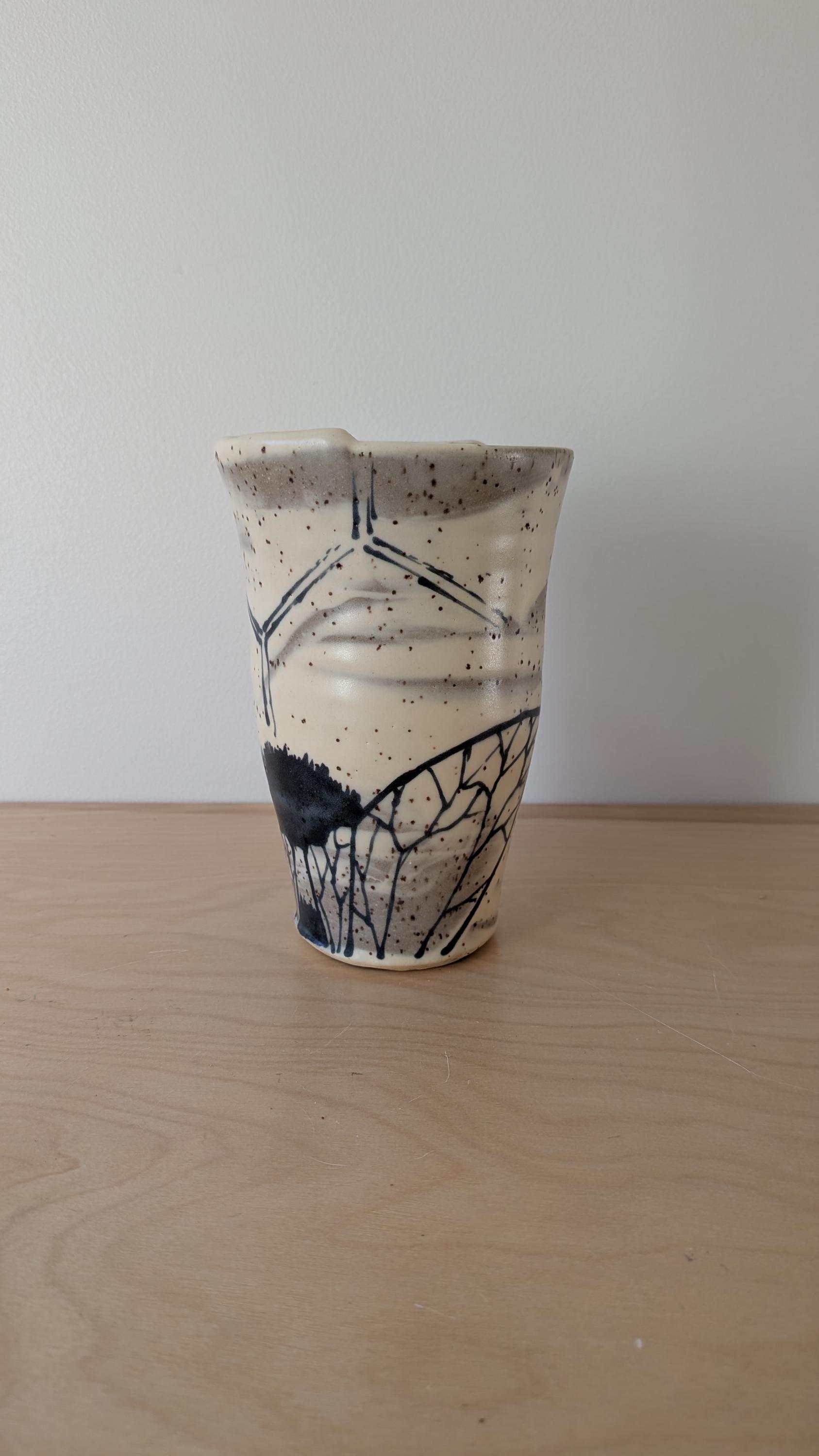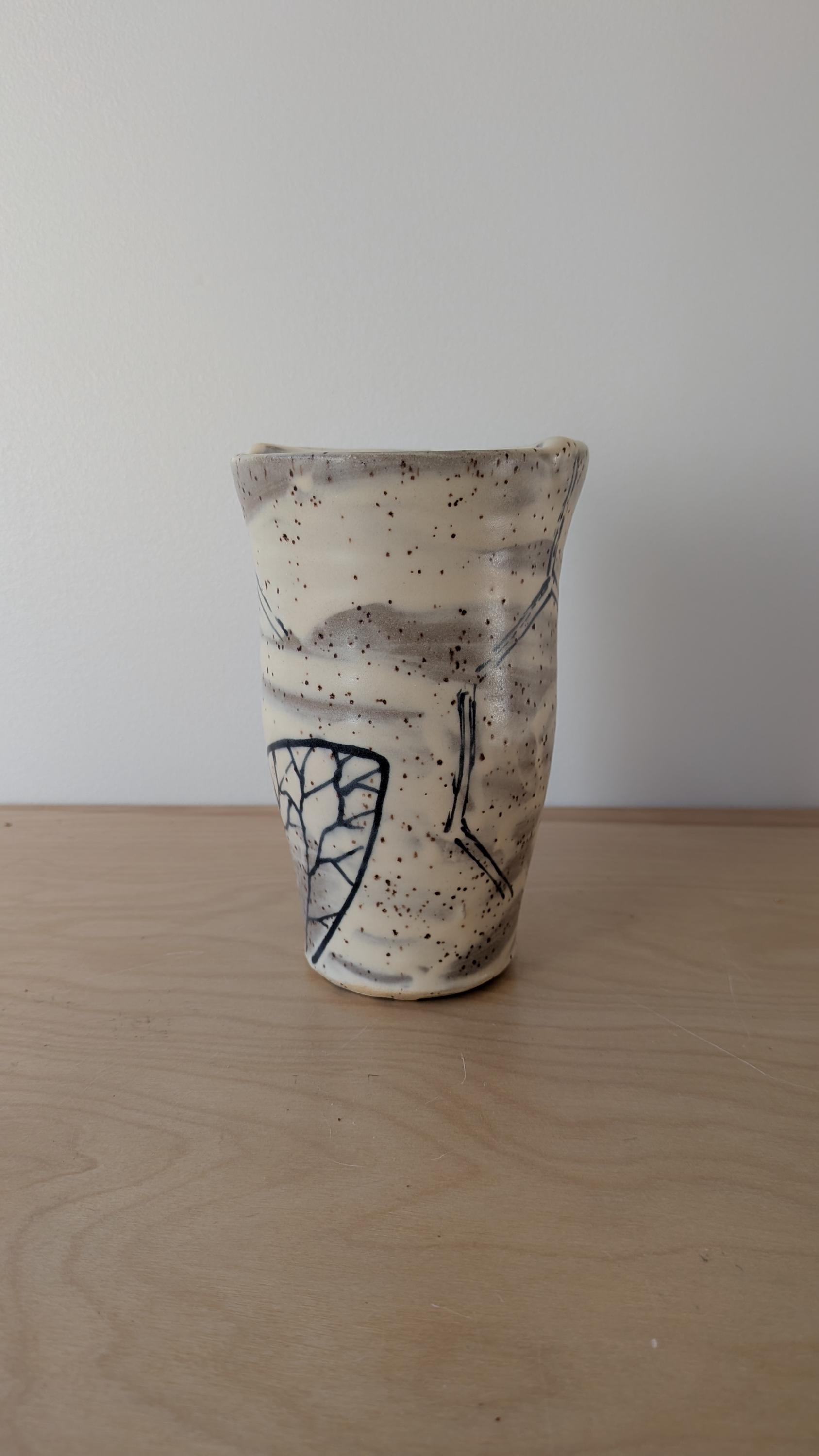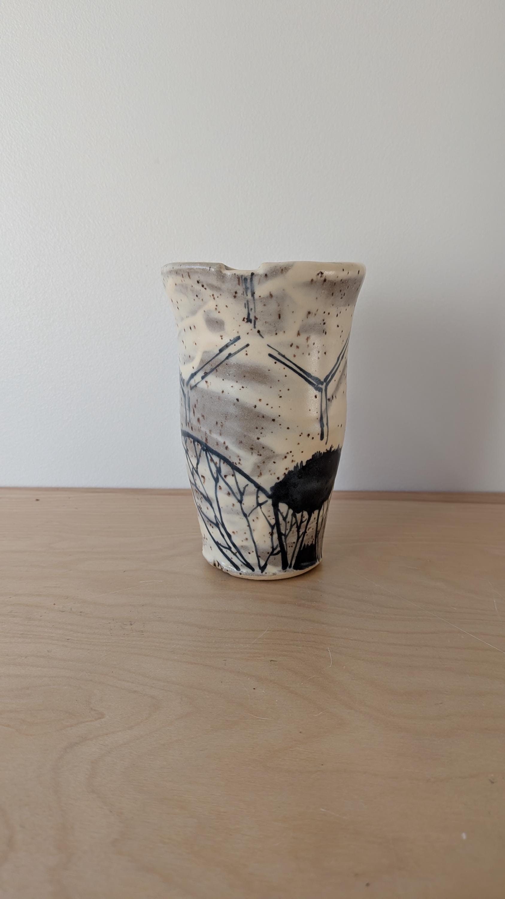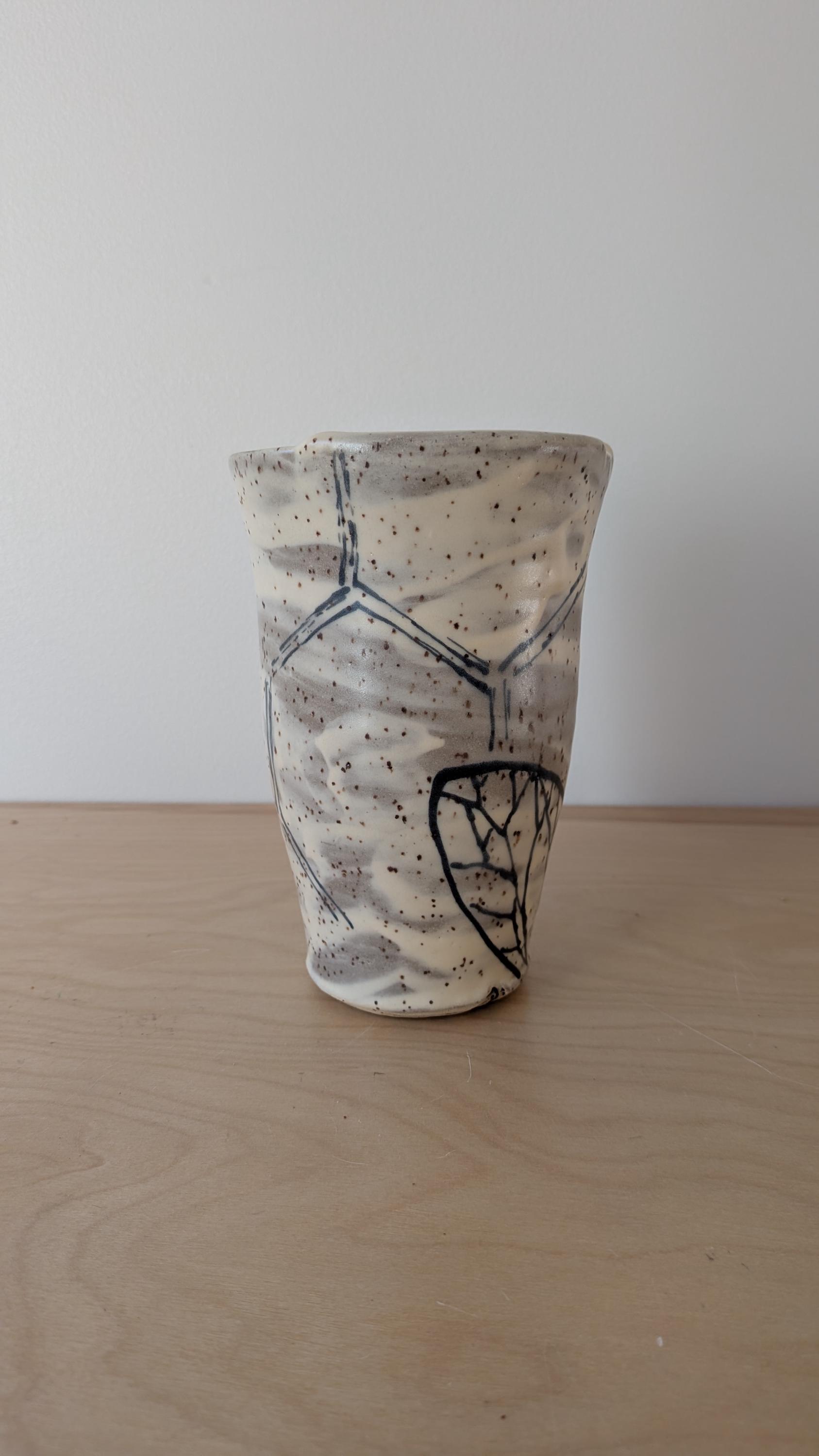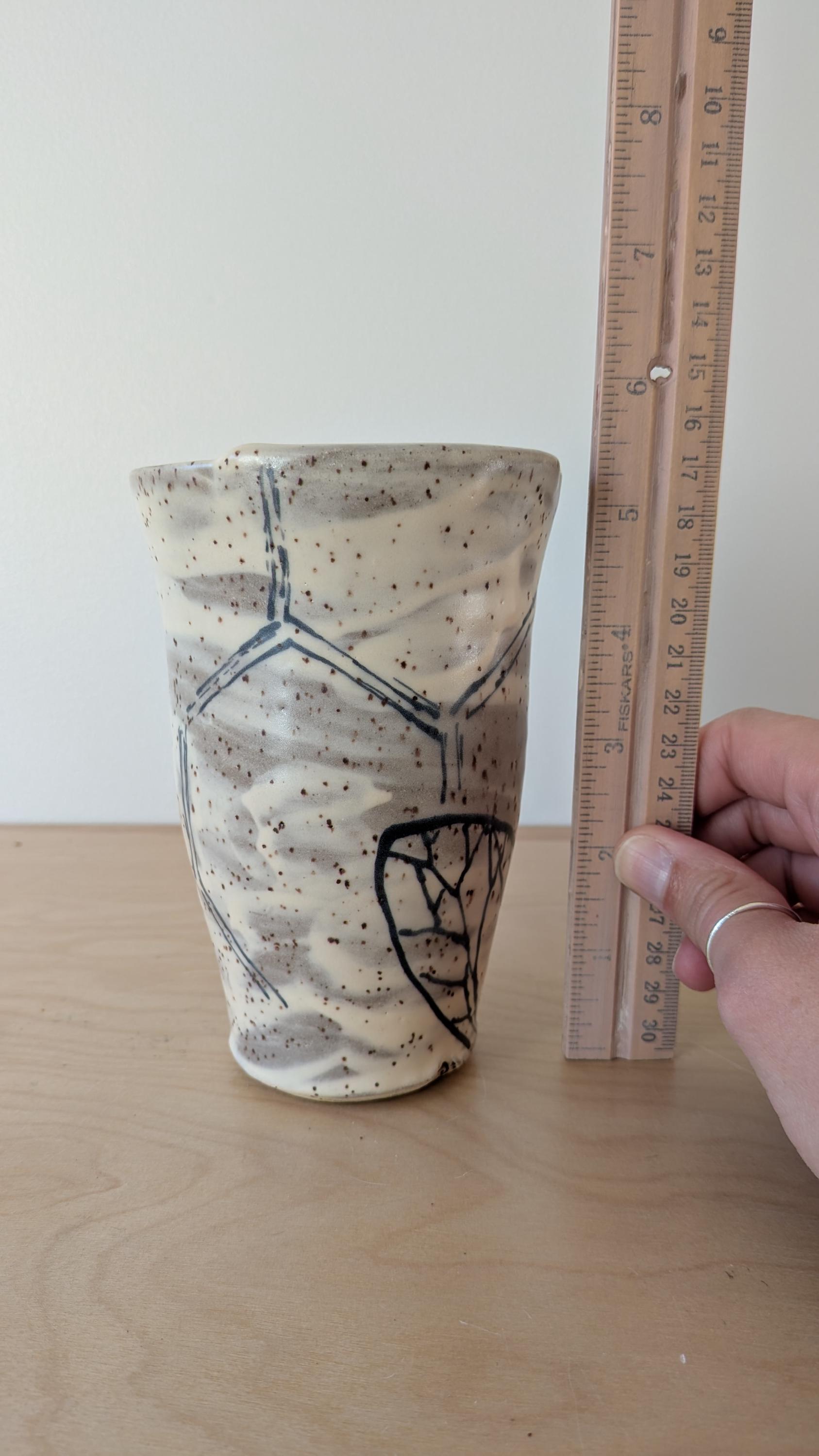 Each design is hand drawn on stoneware clay, fired to about 1900 degrees, glazed and fired again to about 2200 degrees.