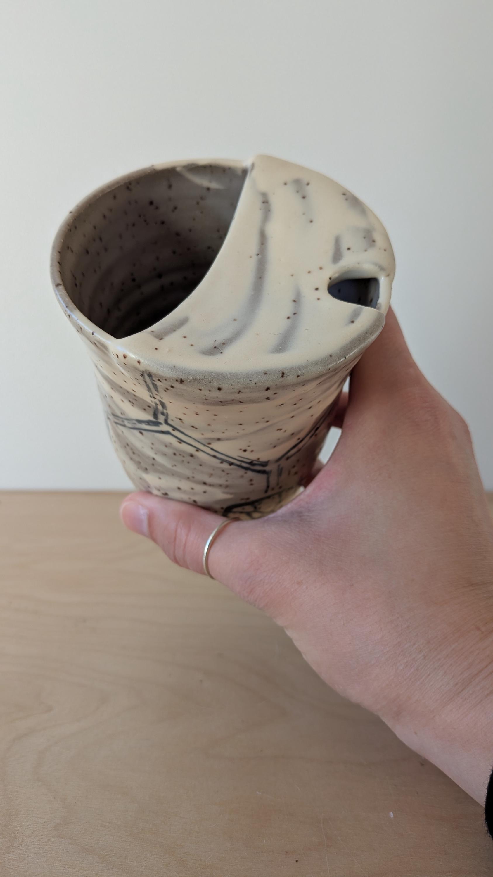 This unique take on a travel mug keeps your liquids warm and splash free while you are out and about. The lid on the top of this stoneware mug is stationary ensuring you don't have any leaks.