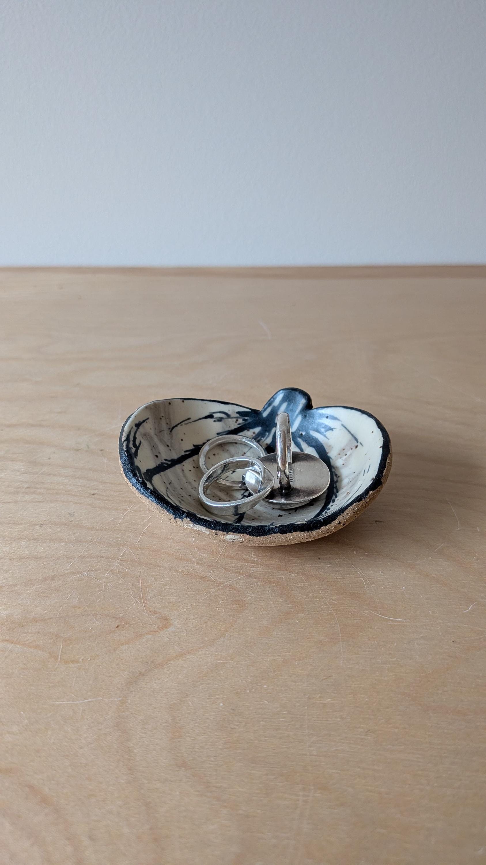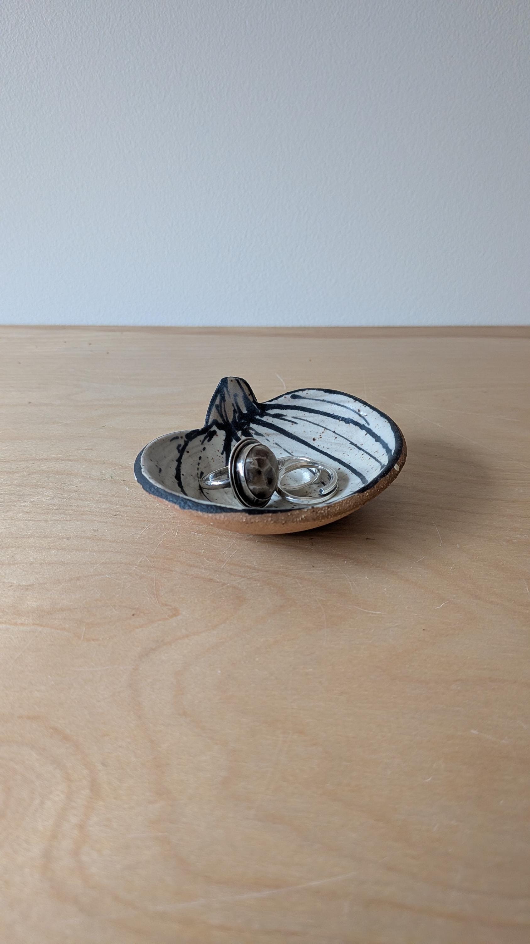 These small dishes are made from stoneware clay and freehand drawn on these can really be used anywhere in your home. Set them in your bathroom, bedside table or kitchen to catch your rings when you take them off or have them in your office space for paperclips or simple display.
