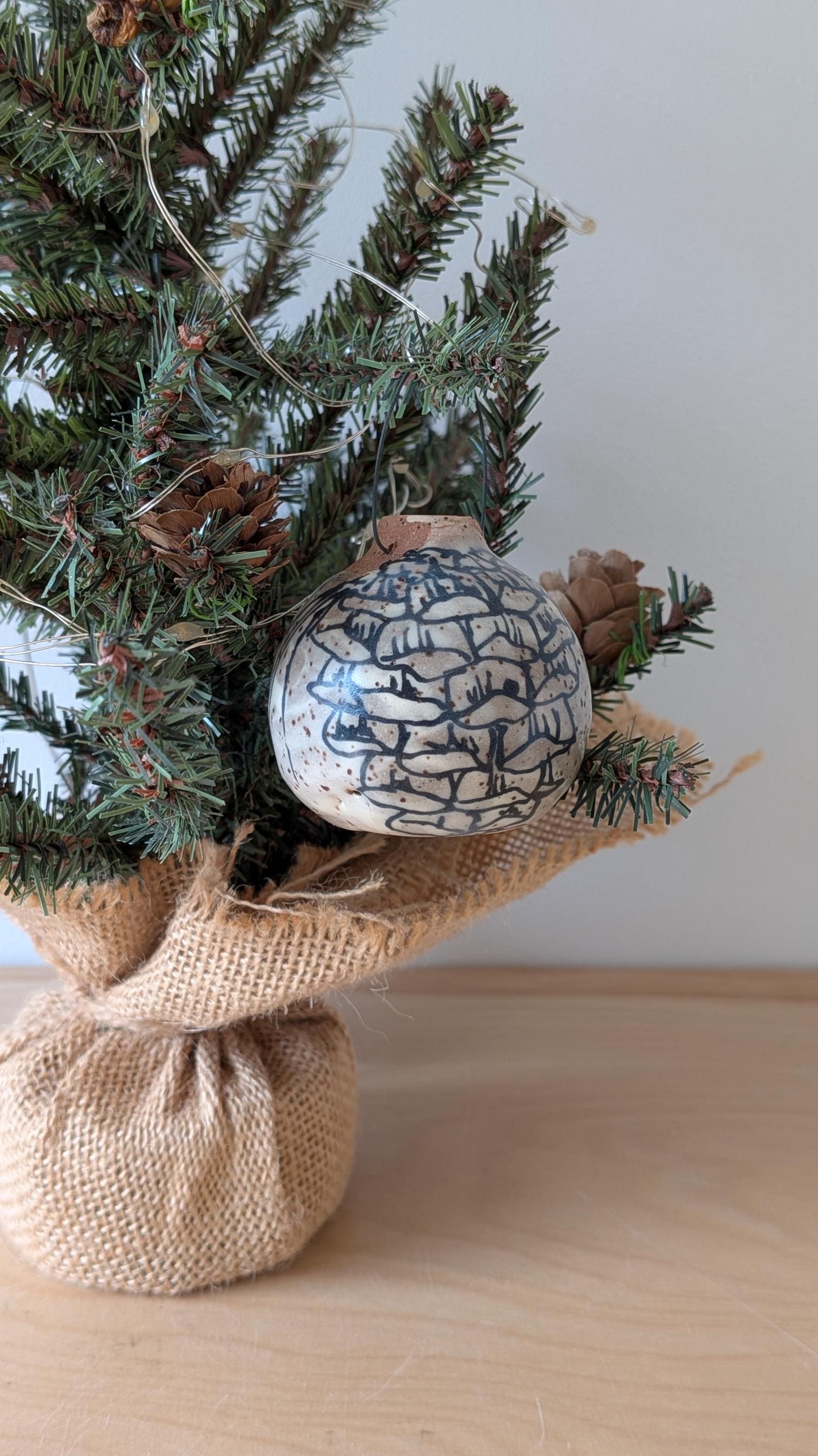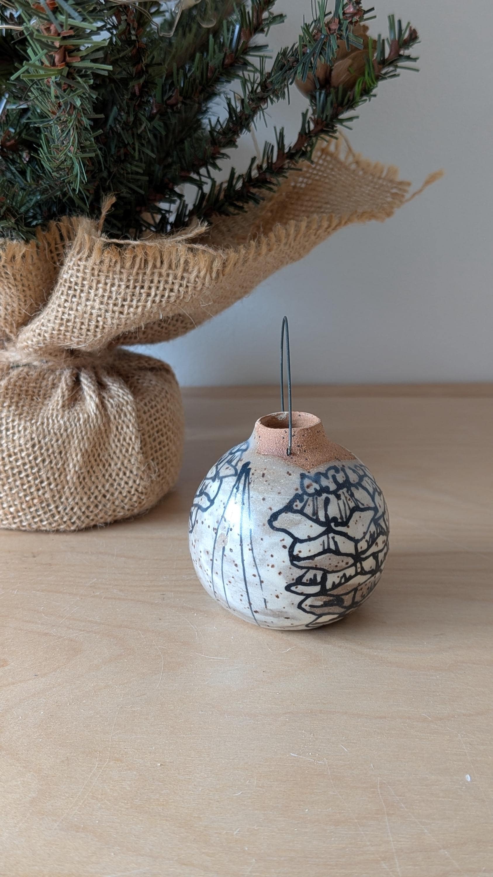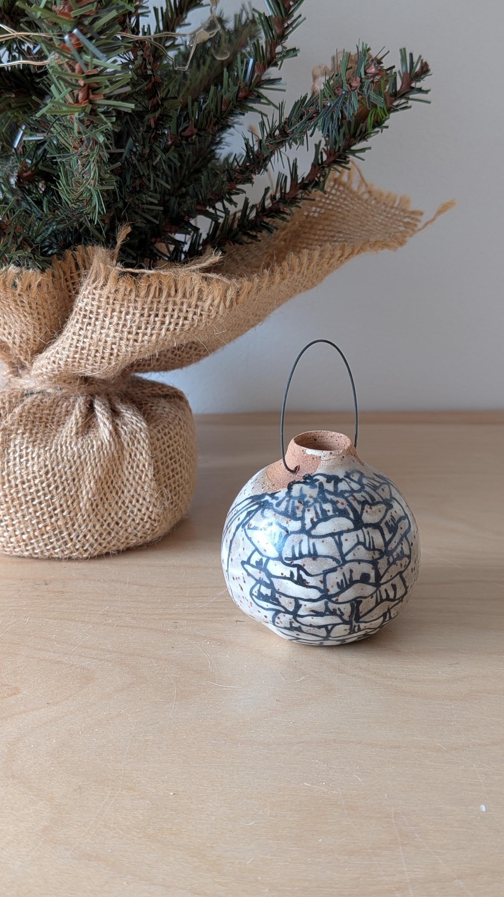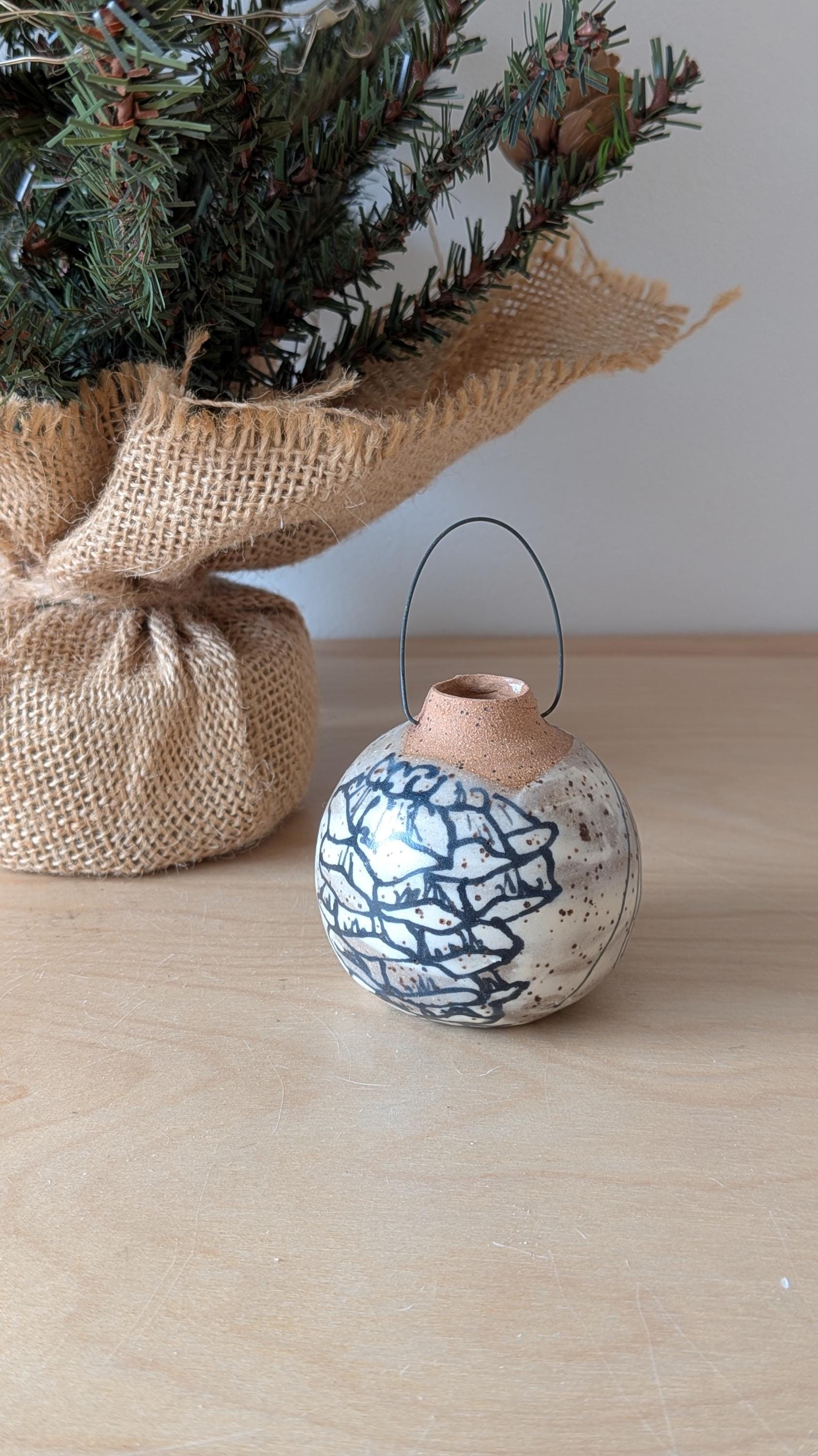 This handmade pottery ornament is thrown on the potters wheel, then bisque fired, hand drawn on, and then fired again to get the product you see here.