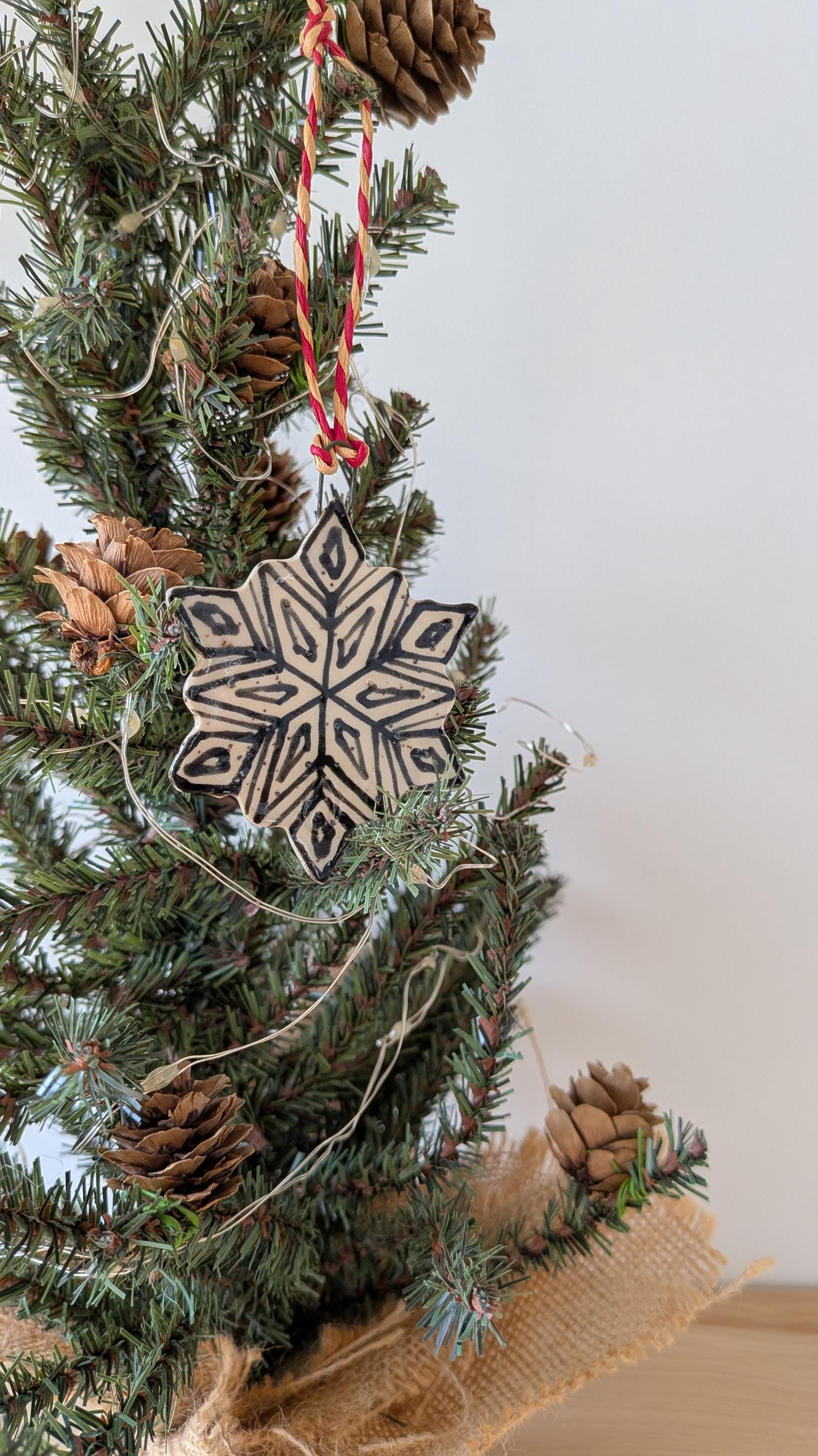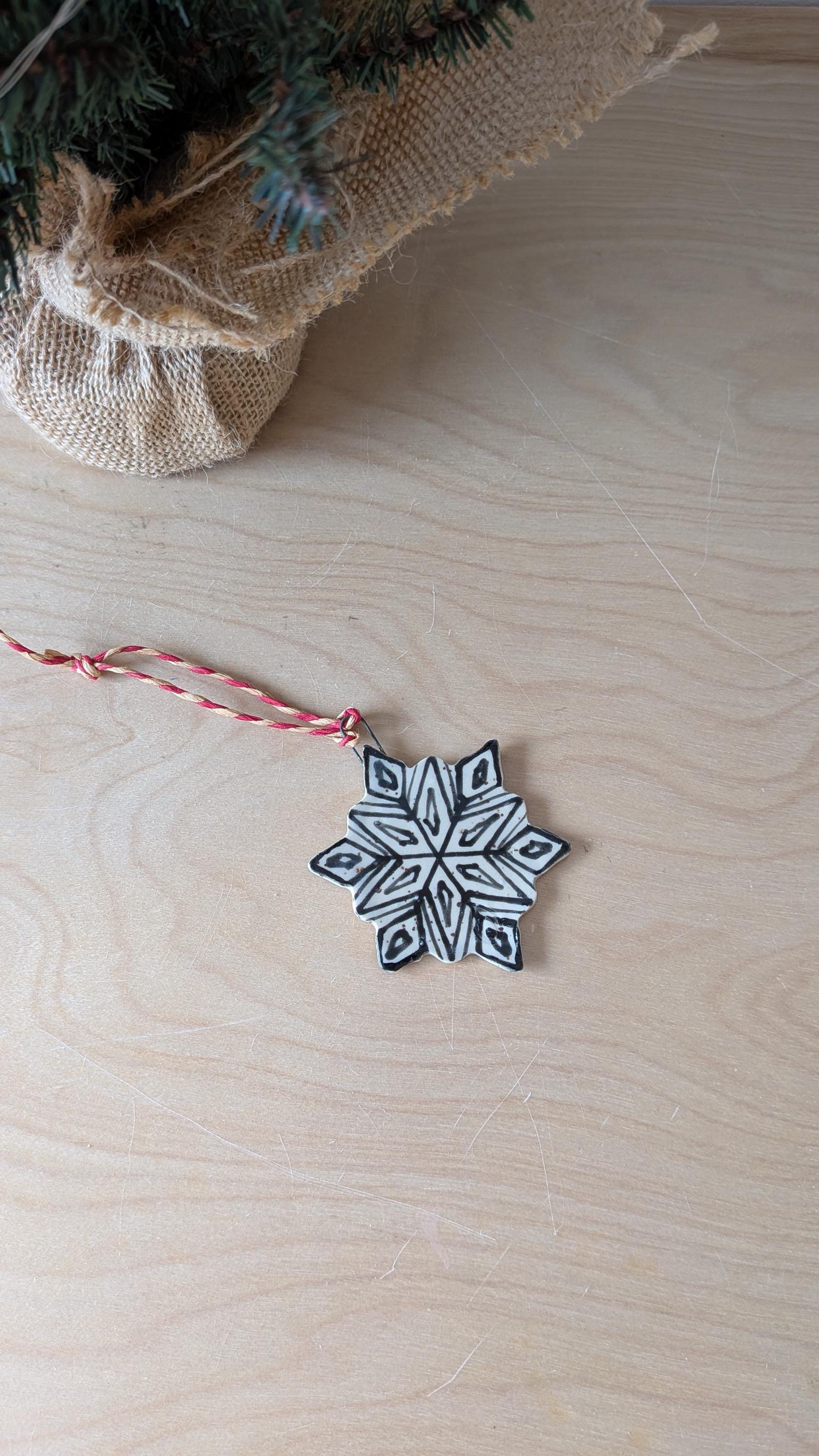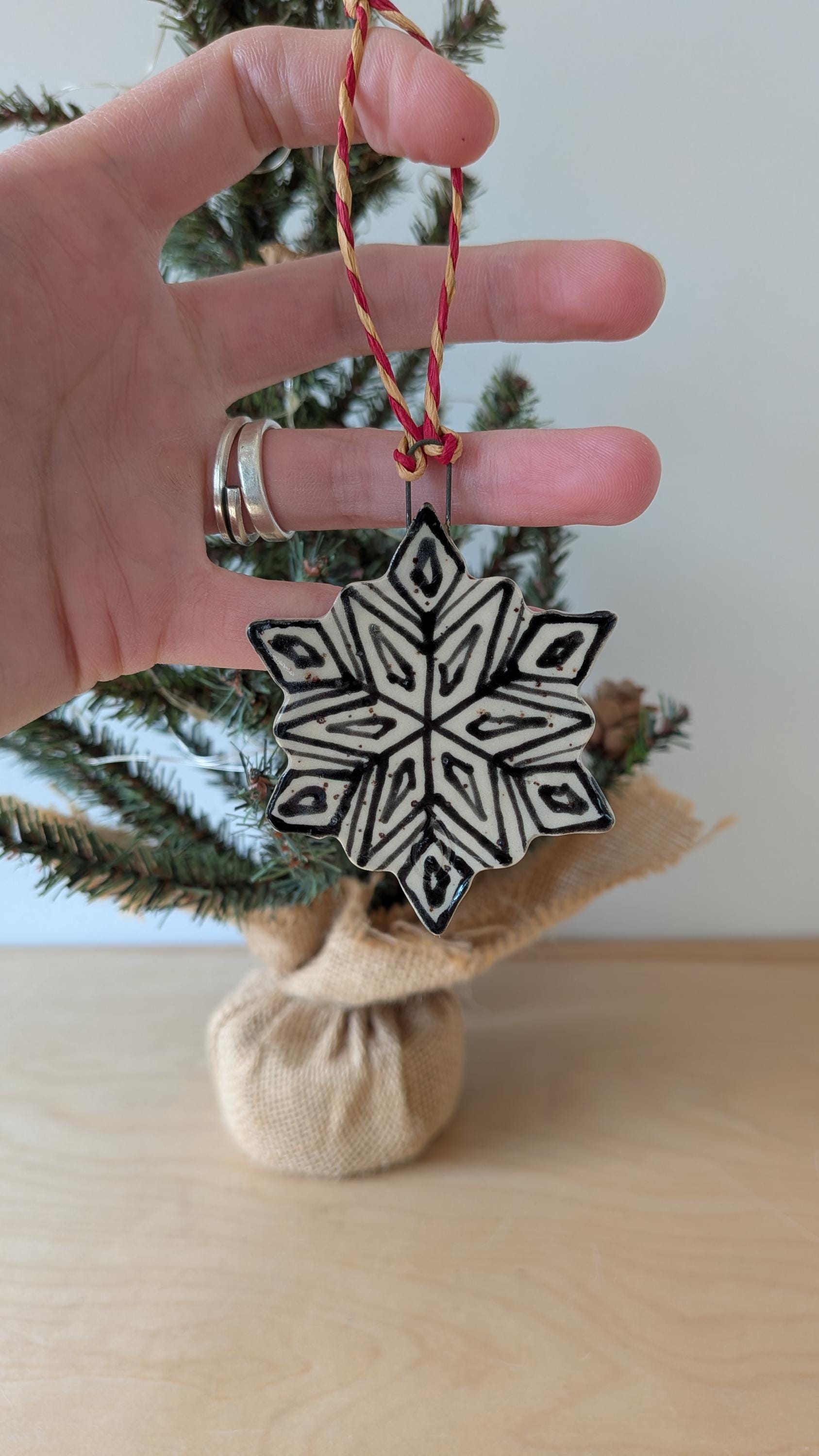 This handmade pottery ornament is thrown on the potters wheel, then bisque fired, hand drawn on, and then fired again to get the product you see here.