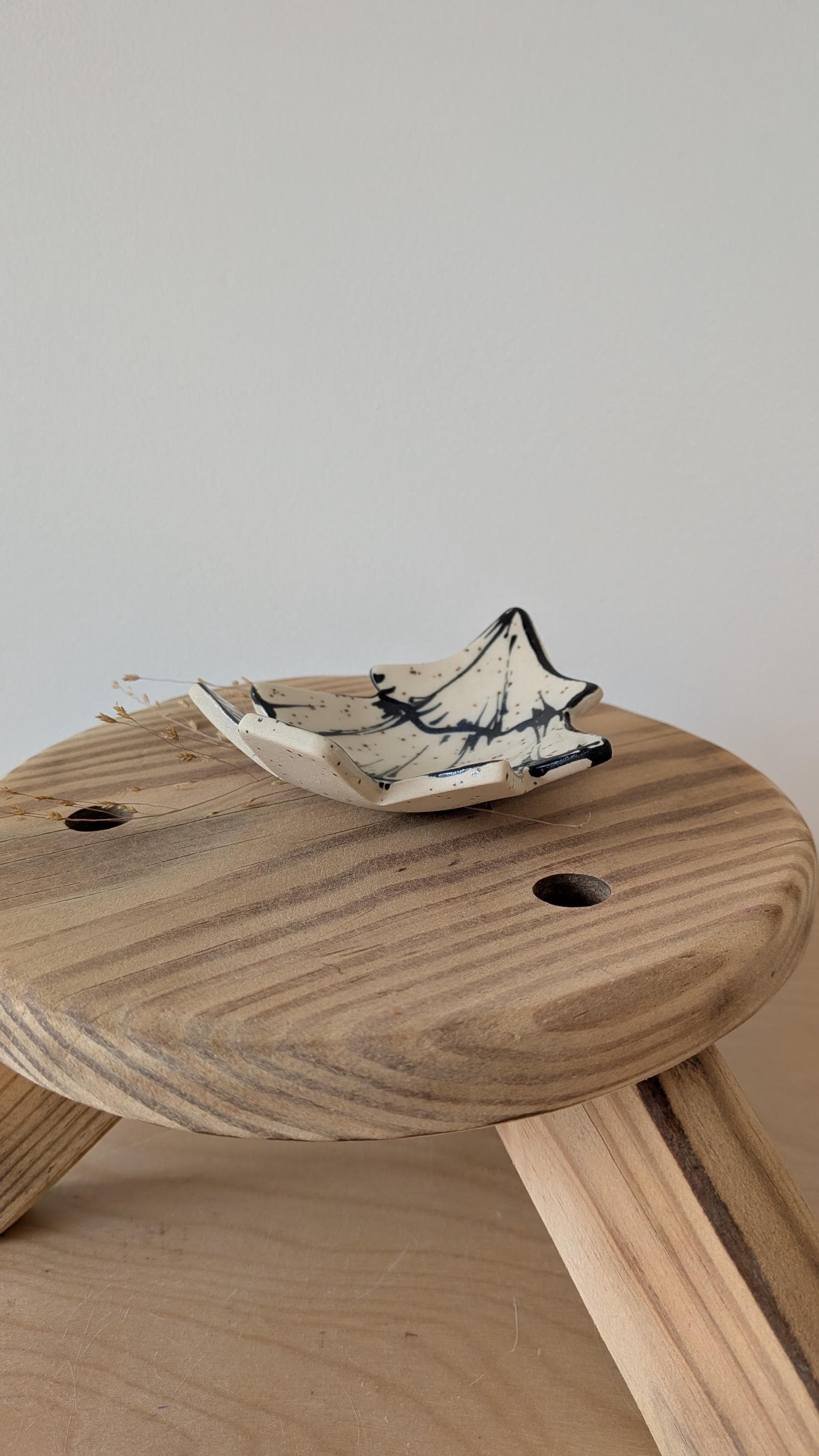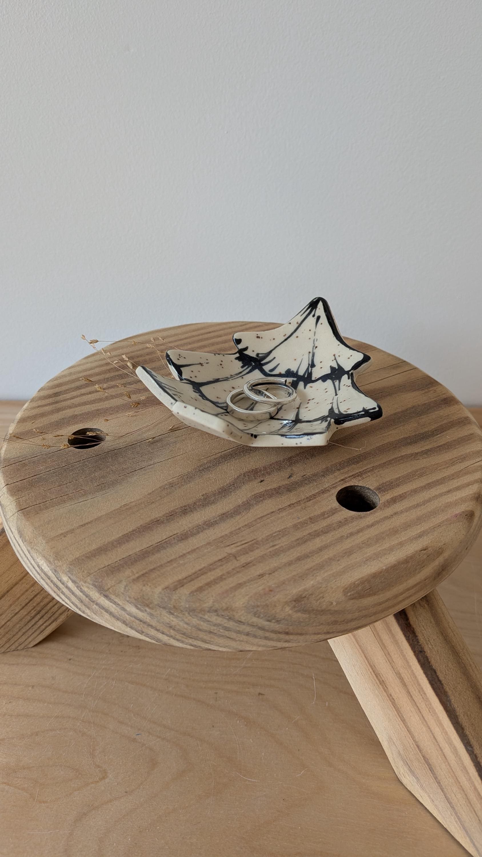 These small dishes are made from stoneware clay and freehand drawn on these can really be used anywhere in your home. Set them in your bathroom, bedside table or kitchen to catch your rings when you take them off or have them in your office space for paperclips or simple display.