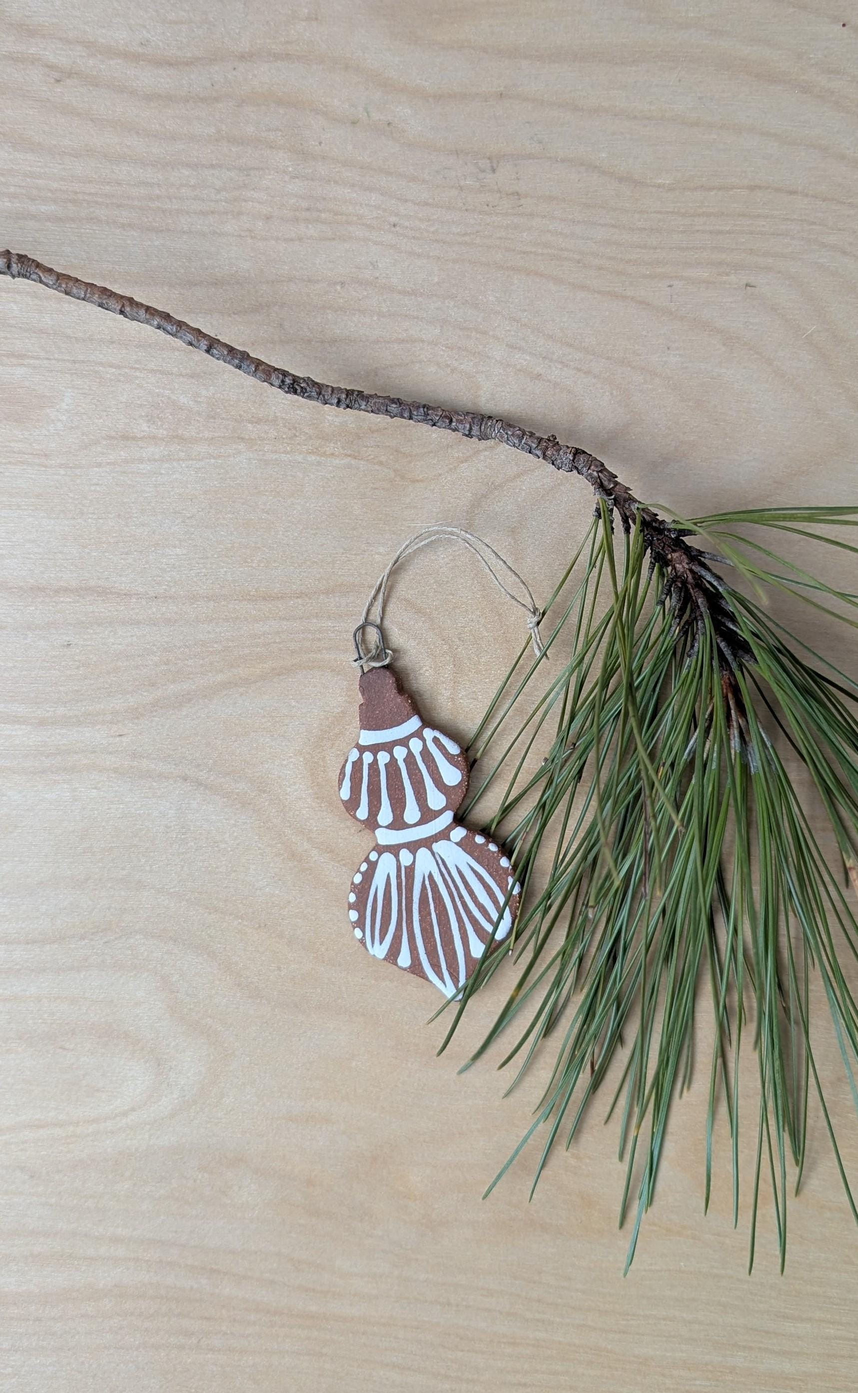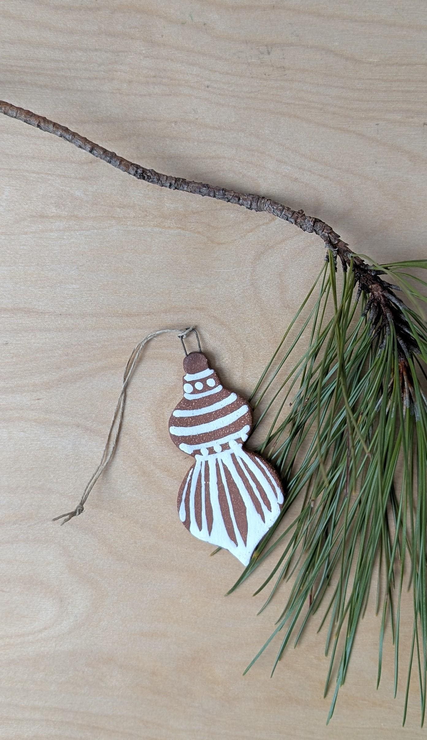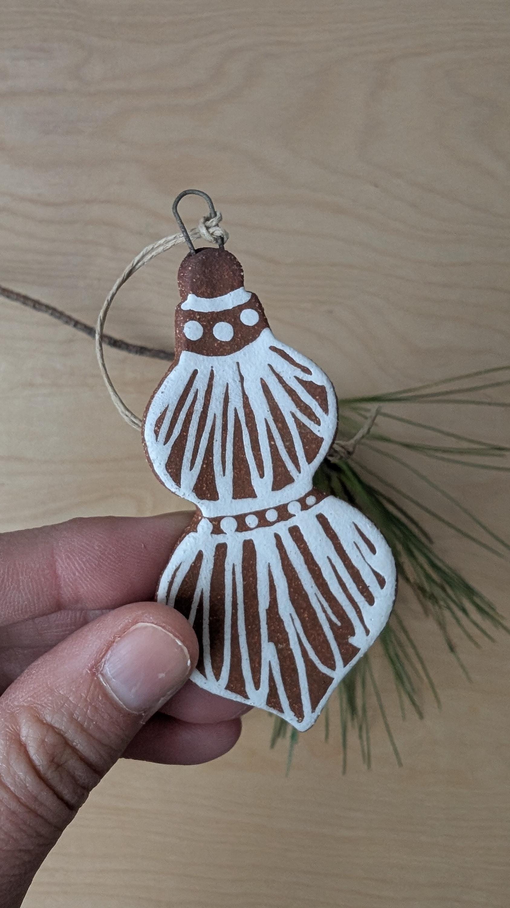 This handmade pottery ornament is thrown on the potters wheel, then bisque fired, hand drawn on, and then fired again to get the product you see here.