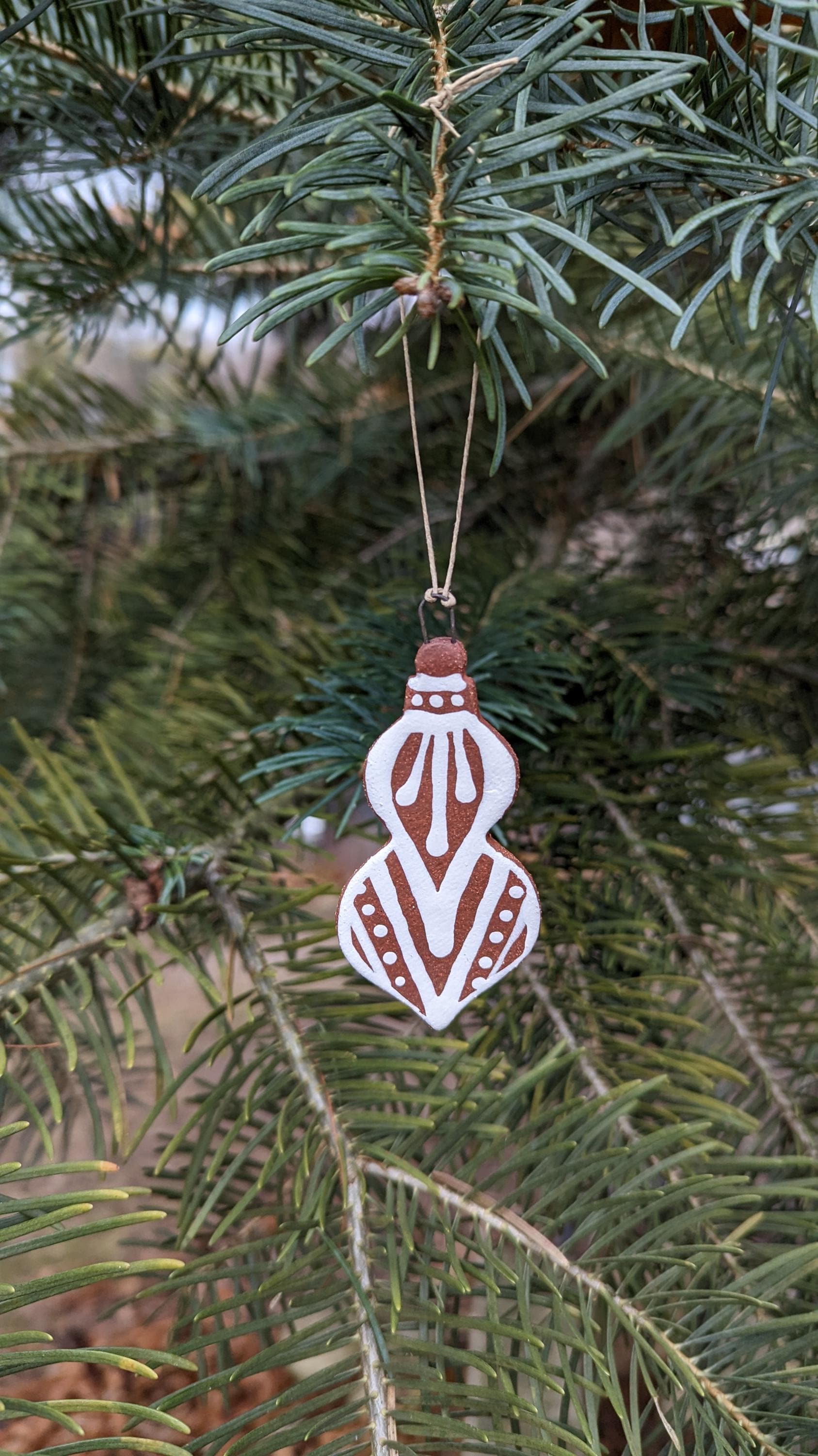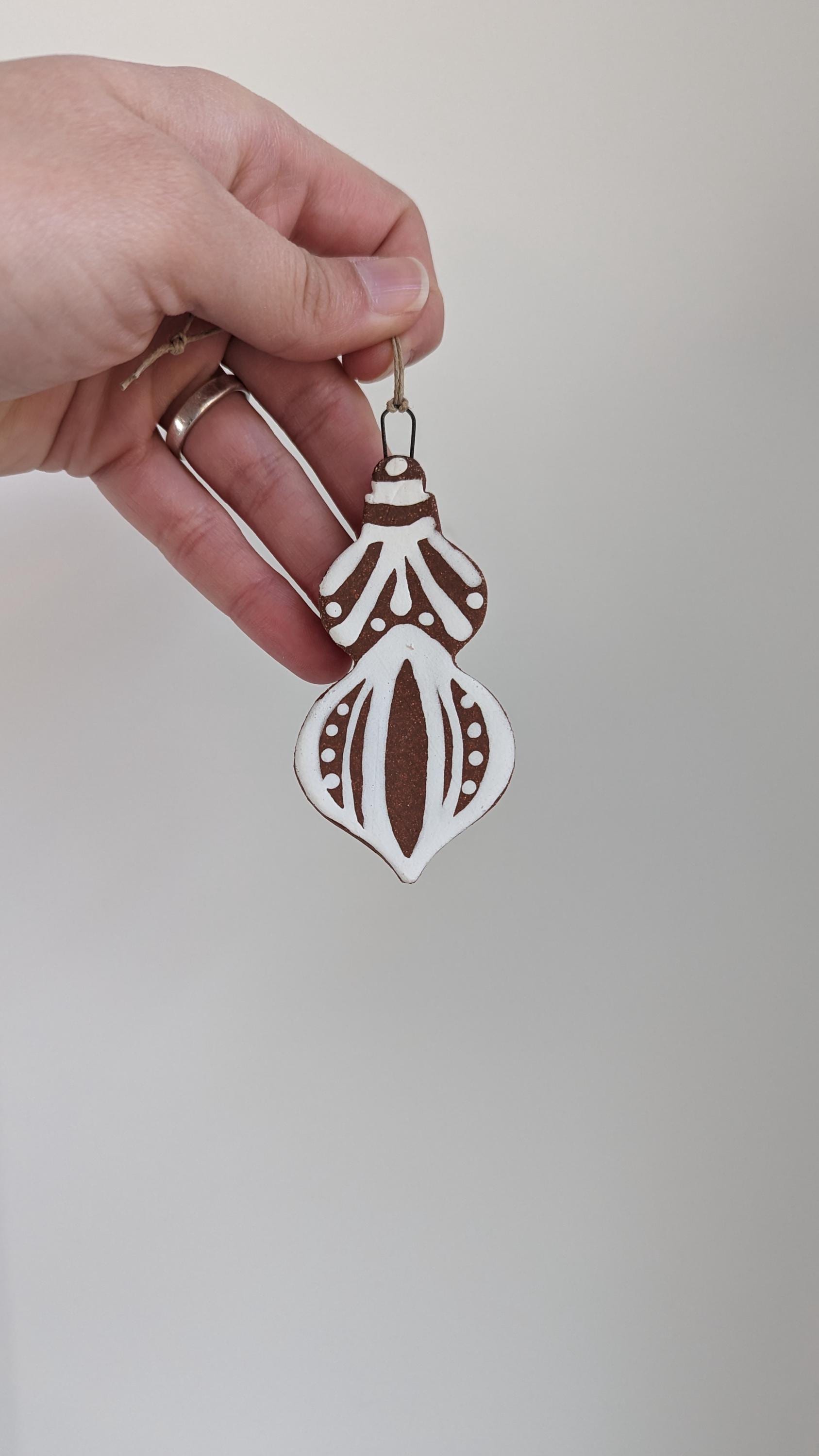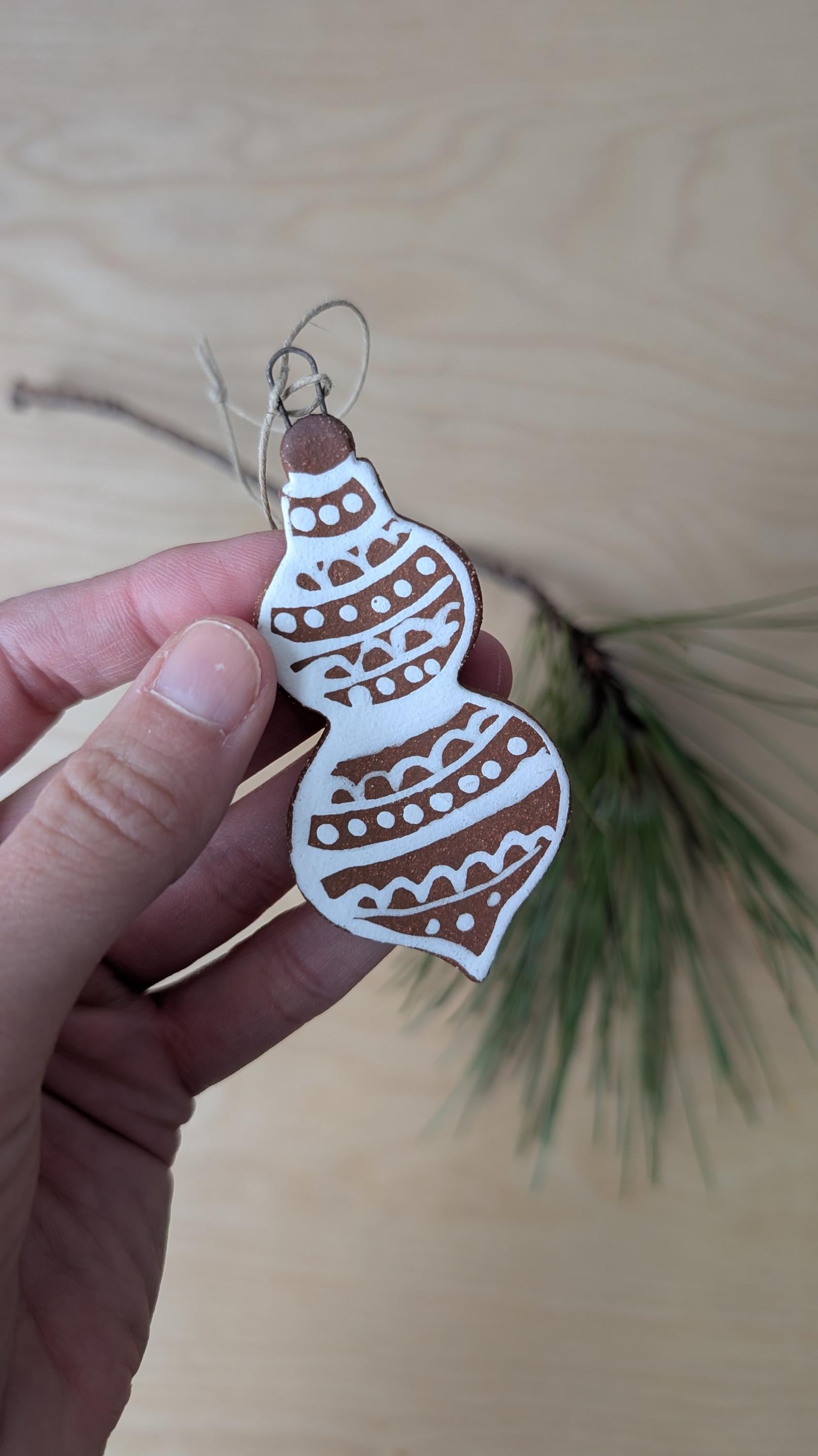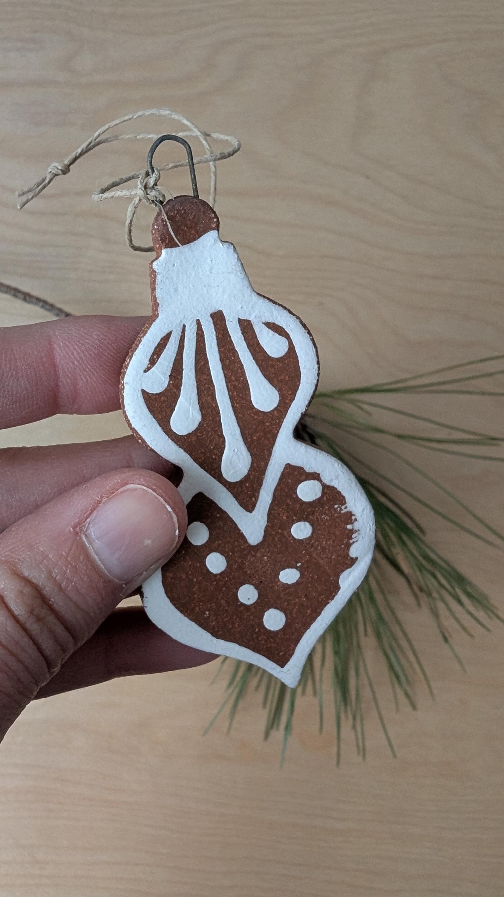 This handmade pottery ornament is thrown on the potters wheel, then bisque fired, hand drawn on, and then fired again to get the product you see here.