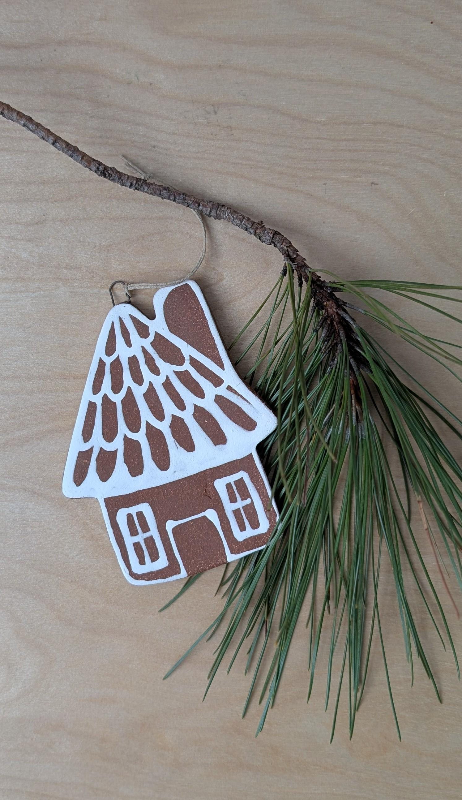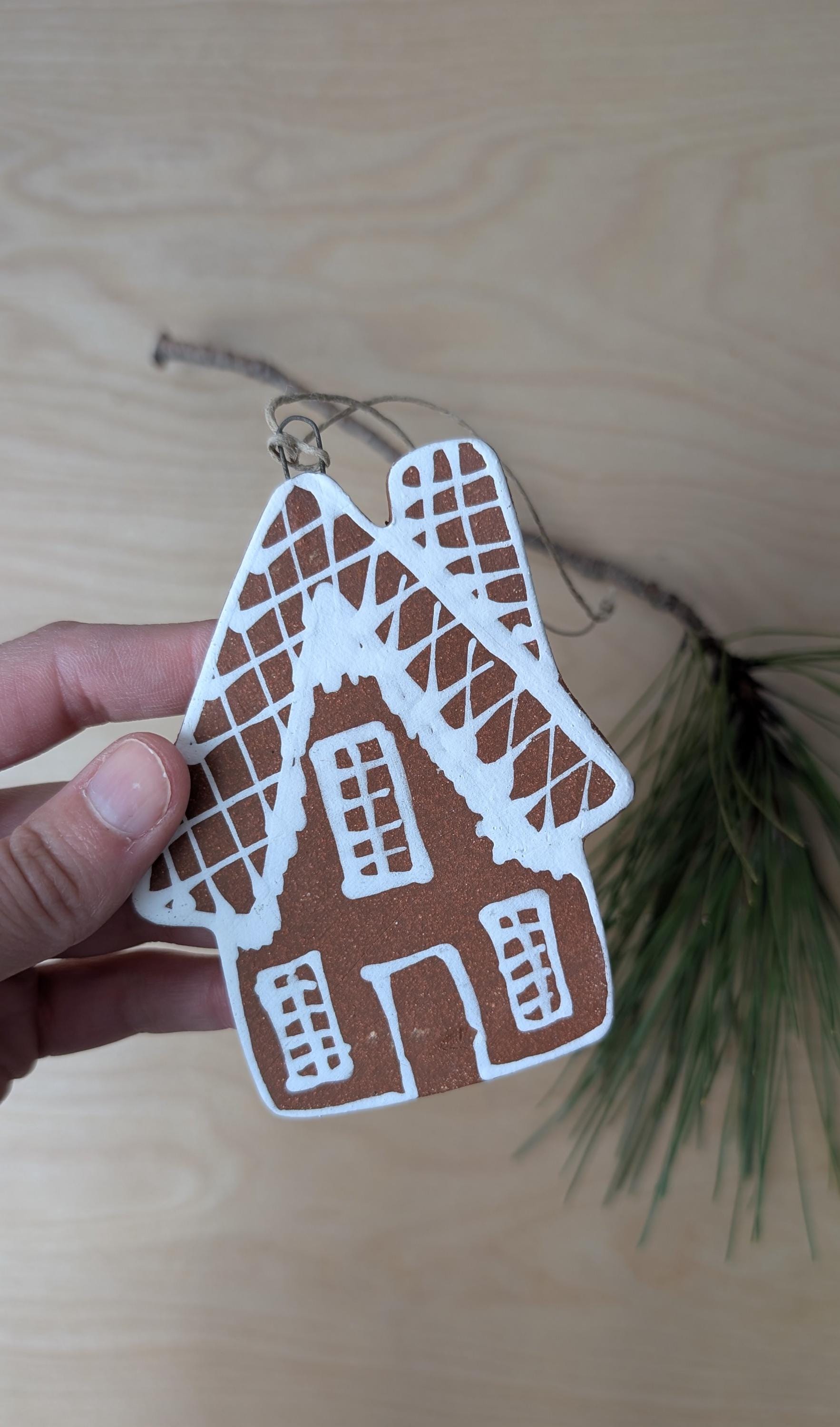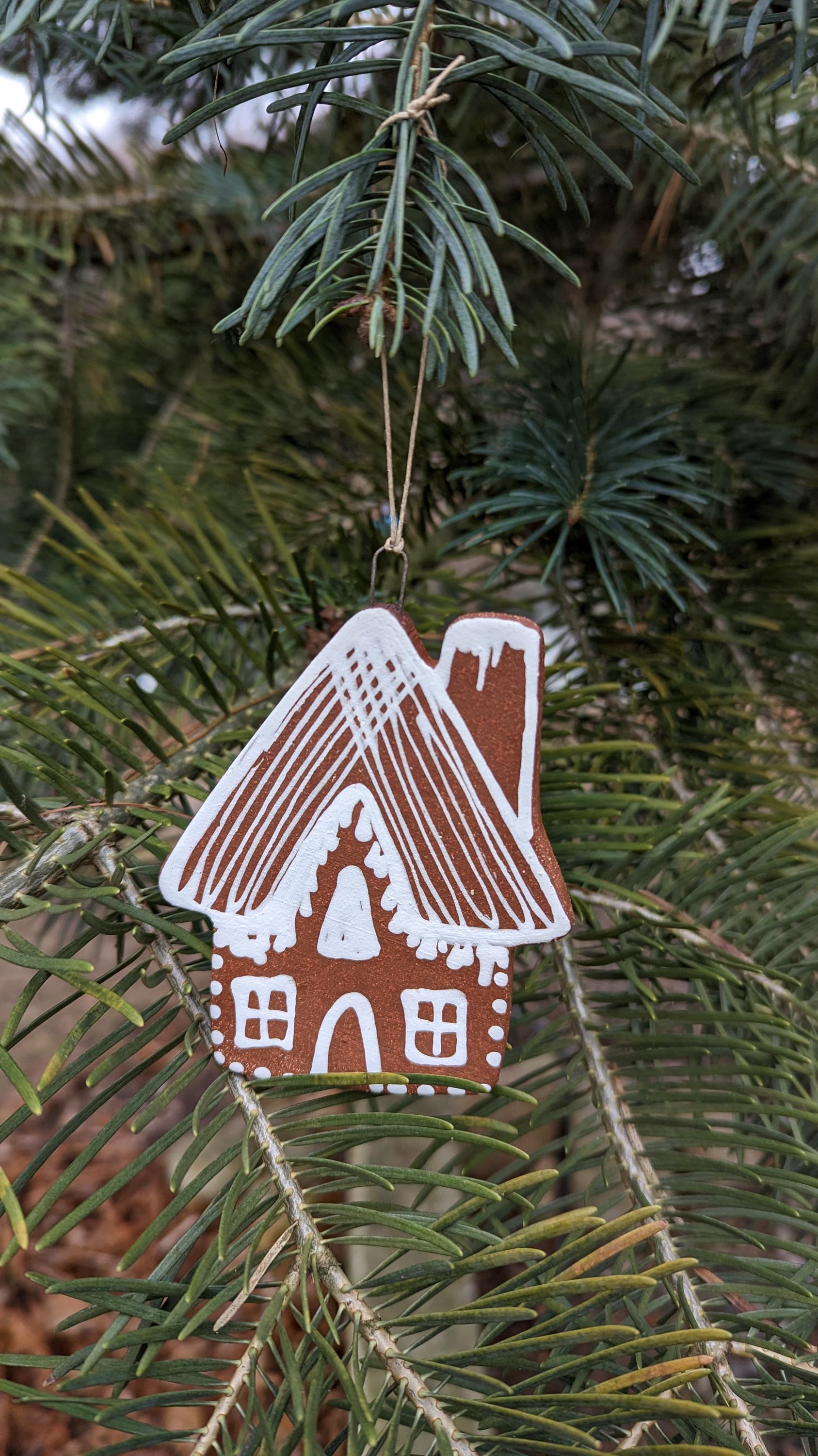 This handmade pottery ornament is thrown on the potters wheel, then bisque fired, hand drawn on, and then fired again to get the product you see here.