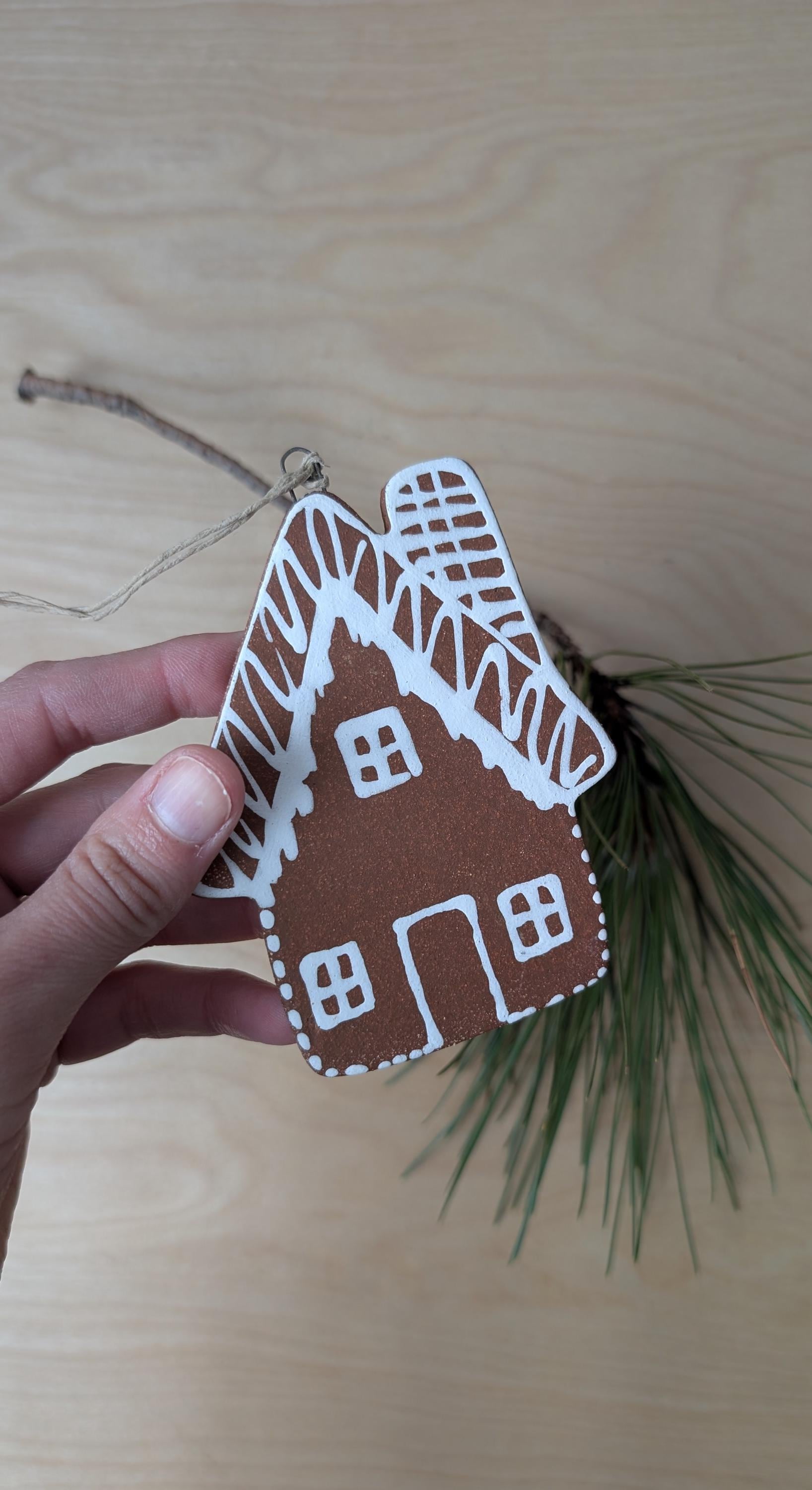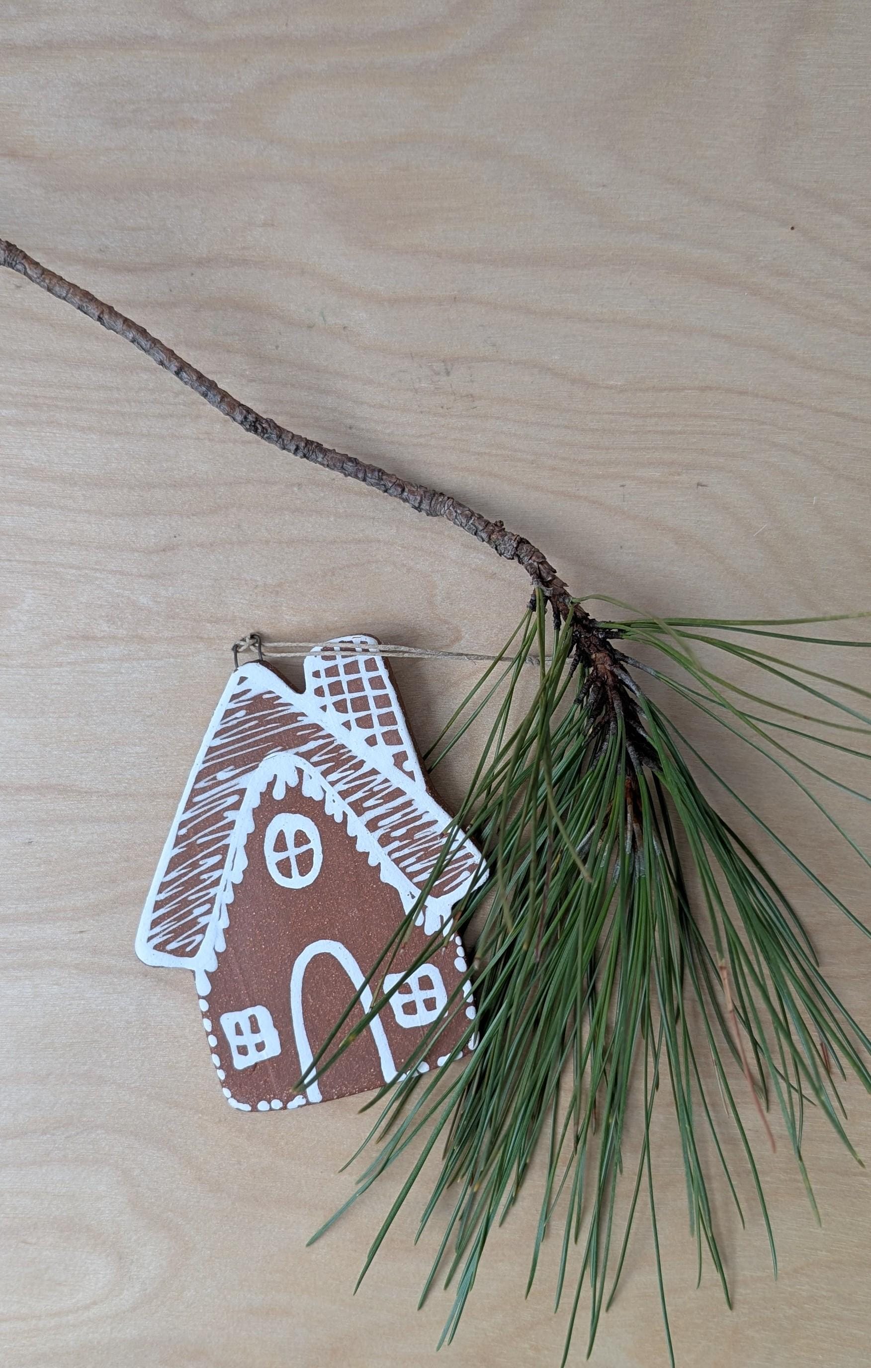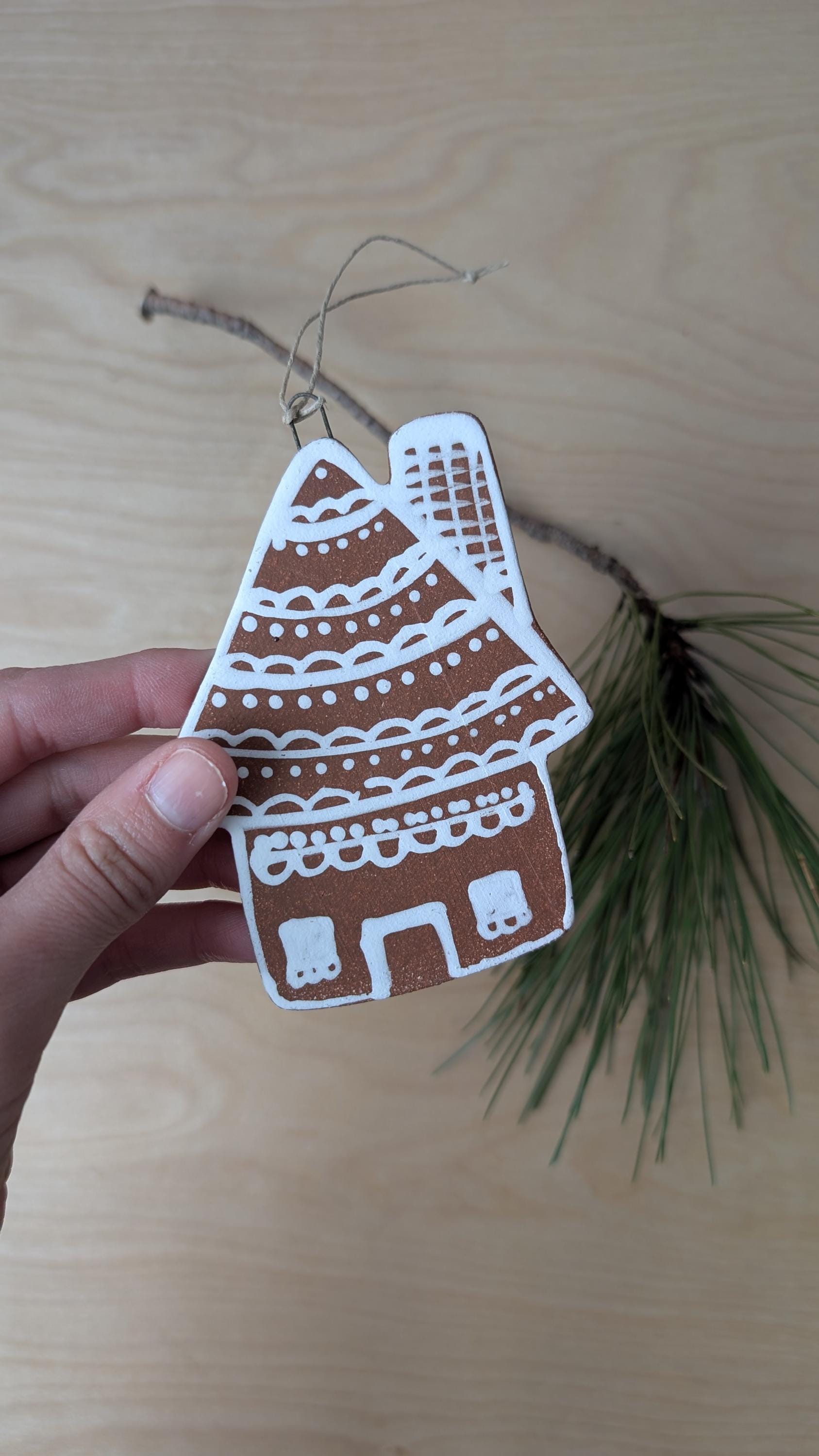 This handmade pottery ornament is thrown on the potters wheel, then bisque fired, hand drawn on, and then fired again to get the product you see here.